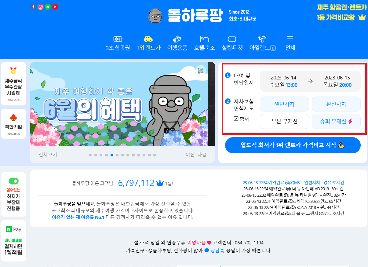 돌하루팡은 95개 이상의 제주렌트카 업체에서 약 1만 8천대 이상의 차량을 비교해 볼 수 있는 곳으로 전 상품 최저가가 아닐 시 차액을 300% 보장해 주는 서비스를 실시하고 있습니다.