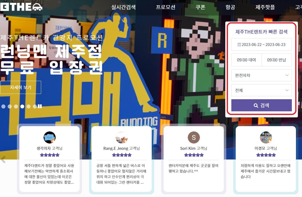 제주THE렌트카는 제주지역에 있는 70여곳의 렌트카 회사 정보를 검색해 실시간으로 가격비교를 해주는 사이트로 여행 일정과 원하는 차종, 연료 등 상세 옵션을 선택하면 업체별 추천을 해주는 편리한 사이트입니다.