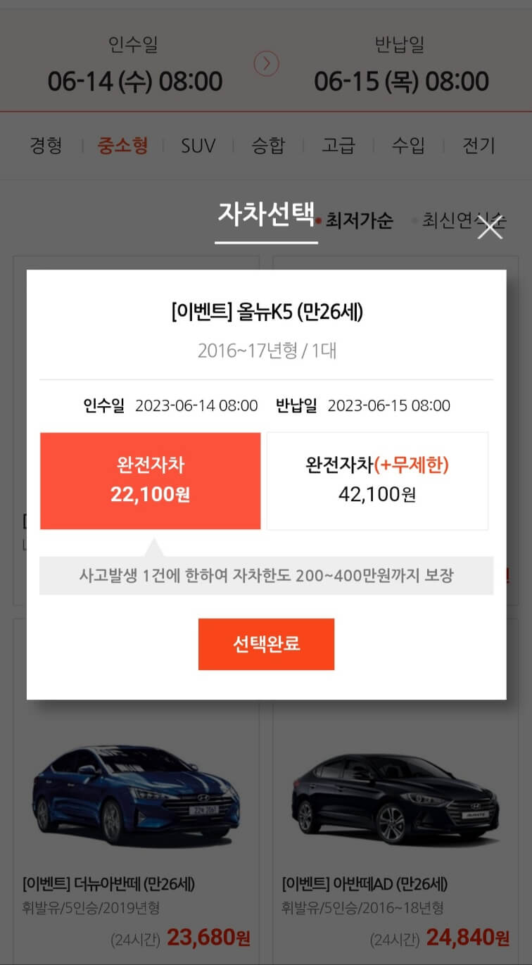 맘에 드는 차종을 찾으셨다면 자차 보험을 선택하신 후 선택완료를 누르시면 되는데요 그러면 선택하신 차의 옵션을 볼 수 있으며 적용보험 및 대여자격 등을 확인해 보시면 되겠습니다.